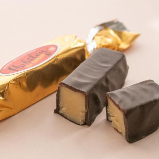 ハビティ[プレーン]バター、生クリーム、クロテッドクリームなど伝統的な配合をアレンジして作られたハビティの基本。オーソドックスで誰が食べても美味しと感じられるプレーンタイプです。表面は薄氷のようにパリッとしたチョコレートでコーティング。中はシャリッとしてバターの香りが広がる。もちろん1つひとつキャンディー包で個装されています。